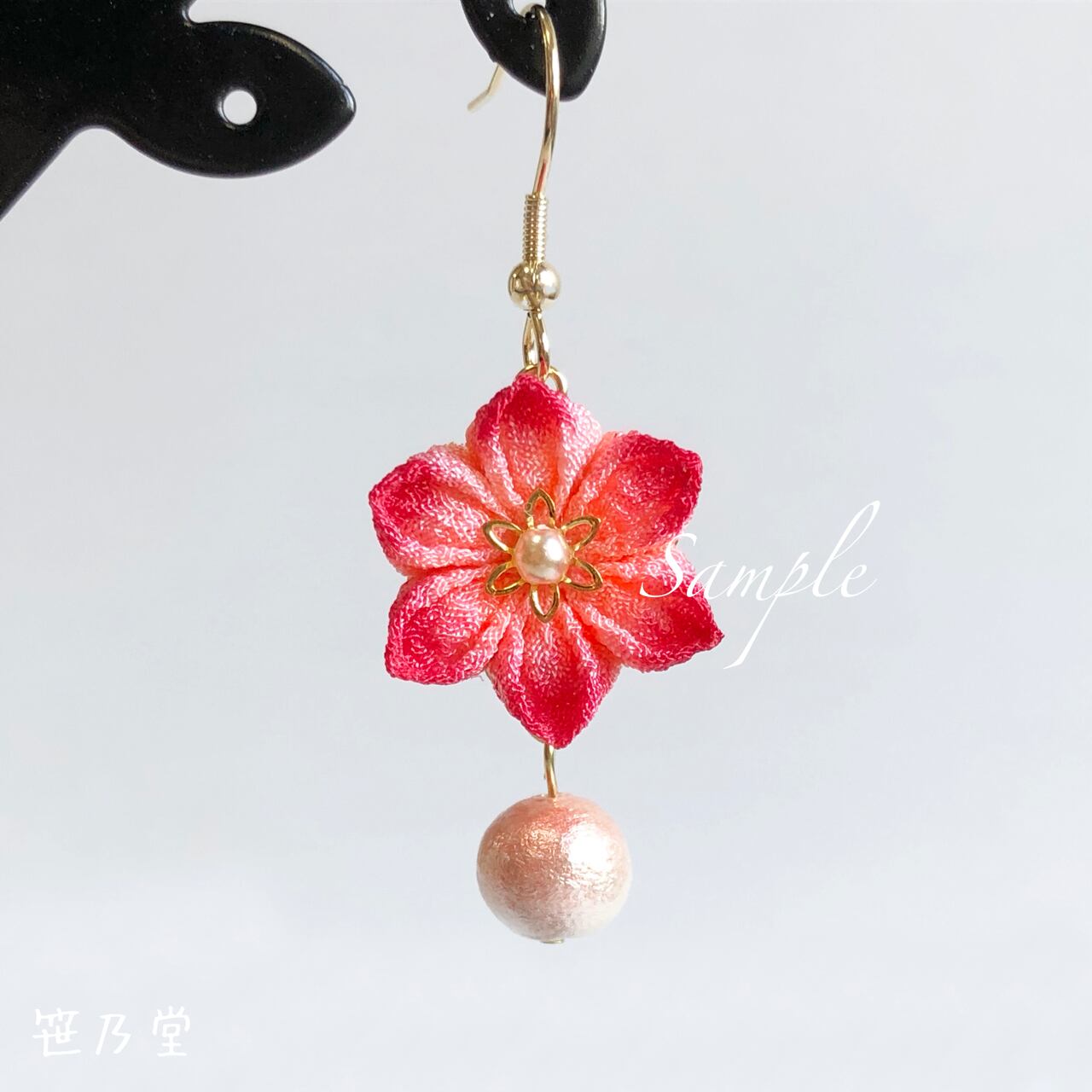 一越ちりめんを赤のグラデーションで染めたつまみ細工の耳飾りです。