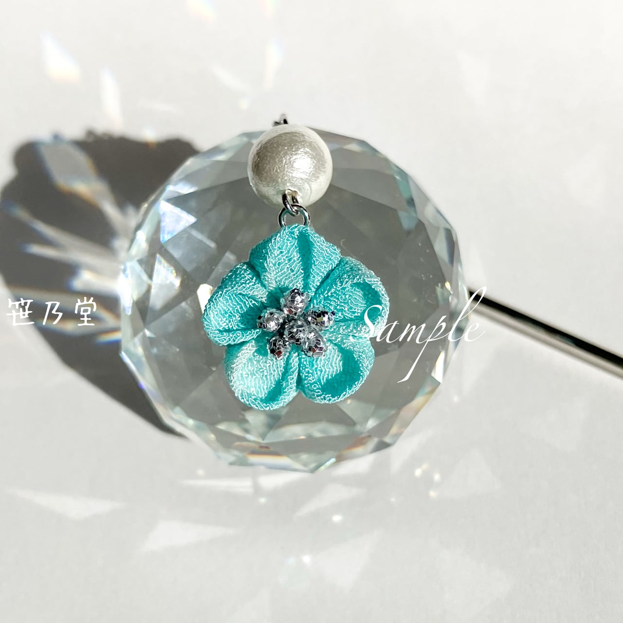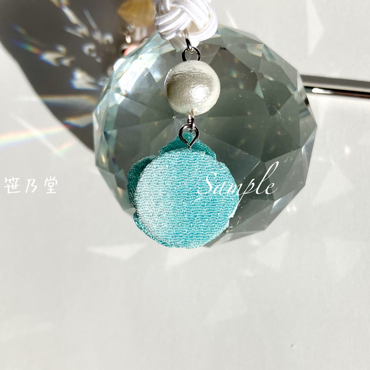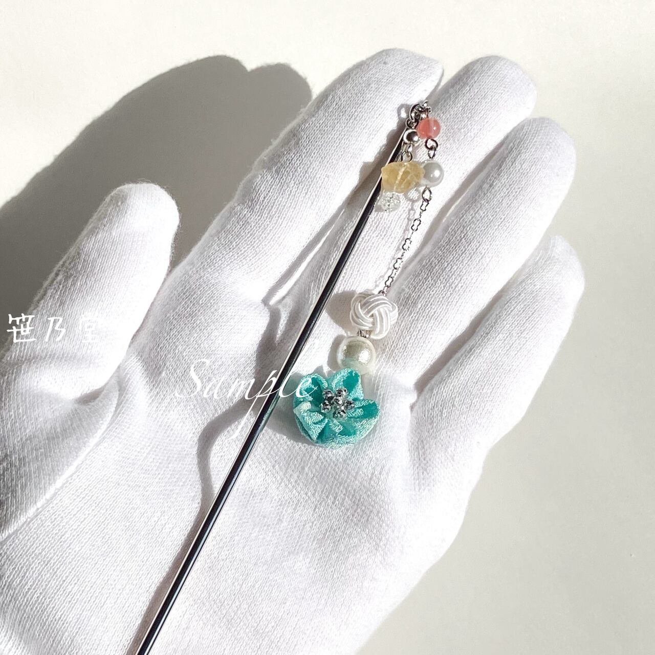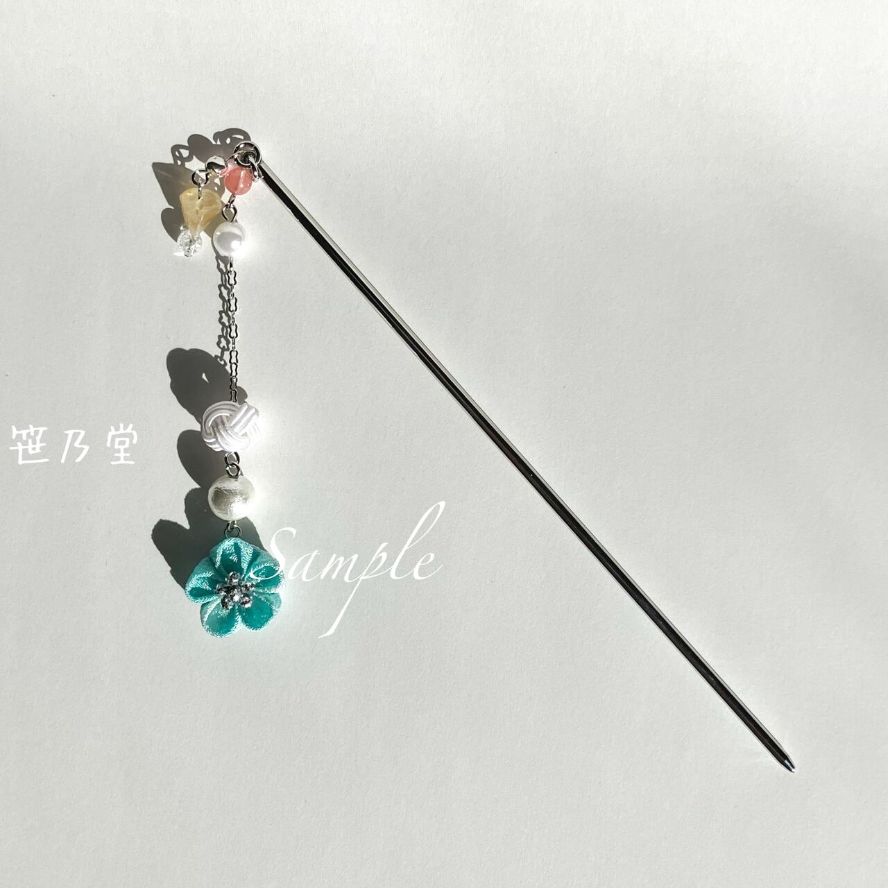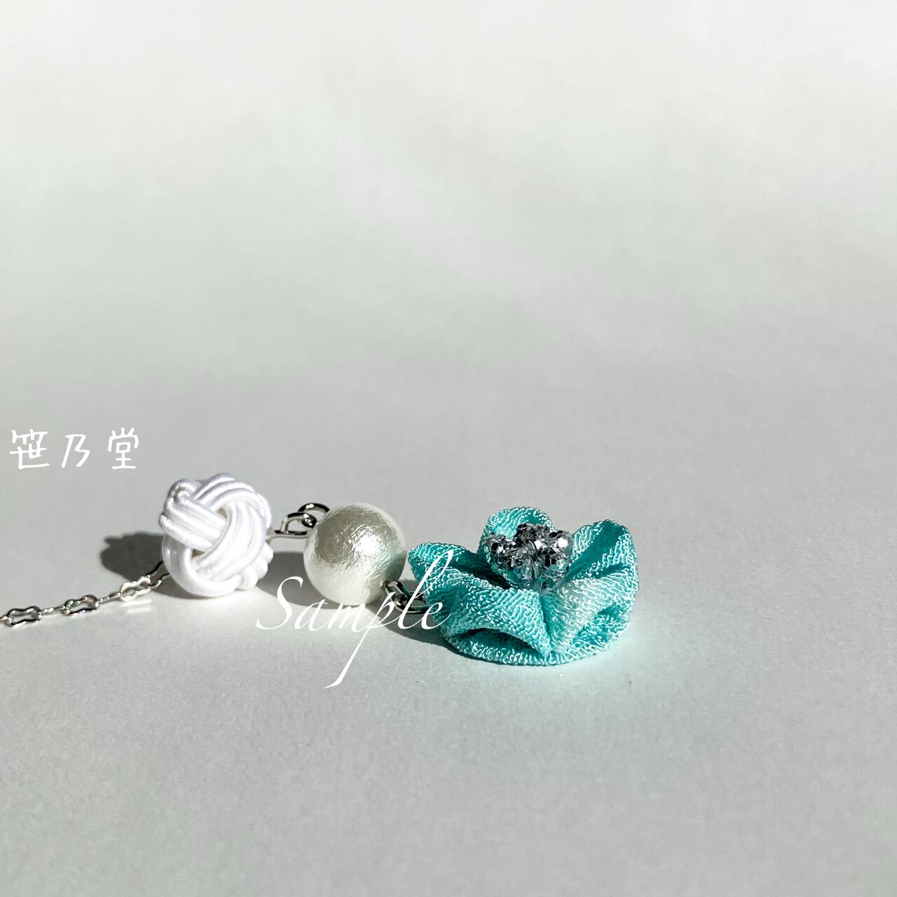 布=一越ちりめん、パーツ=金属(色:シルバー)、パール、ビーズ、ペップ、水引、天然石